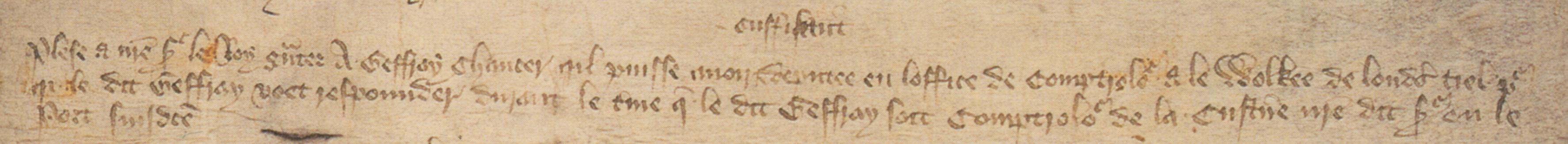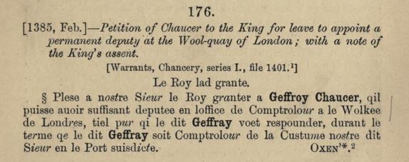In 1385 Geoffrey Chaucer, who held the office of controller of wool customs at London, requested permission from the king to appoint a sufficient deputy for as long as he held the office. The following is the text of his petition to Richard II preserved in the UK National Archives [C81/1394/87], published in Life-Records of Chaucer: