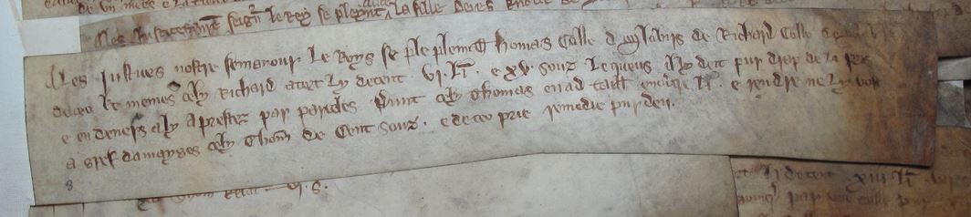 Here, the bill itself, which may have been only the width of a finger, is long absent. It would have contained the details of a claim of trespass recorded on the same membrane, according to historian Andrew Hershey. As Hershey points out, this reference is unique. If complaints, usually oral, were written on bills these may have been kept with files of writs, now lost, and not usually attached to the roll, even temporarily as this one seemed to be.