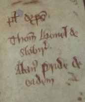 Another writer, a clerk of the court, would use the bill to make annotations as the case progressed. Here the back of the bill has the names of two pledges for prosecution, Thomas and Alan: